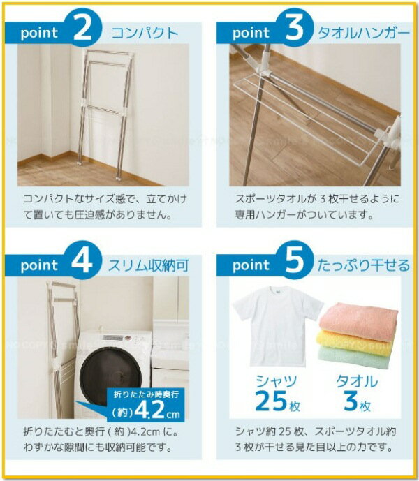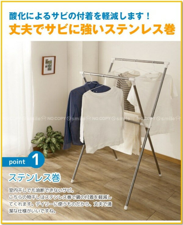 【商品説明】 サビに強いステンレス巻仕様のX型室内物干しです 雨の日や梅雨、花粉、PM2.5の多い時期も安心! 外出がちで部屋干しの多い方に最適! 使用後は折りたたんでコンパクトに収納できます。
